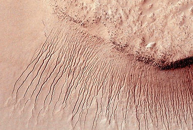 Before we get ahead of oursleves, it must be stressed that this "liquid water" on present-day Mars is only small amounts of damp soil, not "pools of standing water" like what could have been on Mars some billion years ago. Thanks to readings from orbit, waterlogged molecules were indentified by scientists in a paper published in the journal Nature Geoscience. These molecules are a specific kind of salt known as perchlorates, Found on Mars' surface, they were an instant indicator of water in the form of hydrated salts. This is due to the fact that, in order for hydrated salts to be produced, water had to have been present "recently," or over the span of a couple days. In 2011, "dark streaks" were discovered by one of NASA's high resolution cameras known as the Mars Reconnaissance Orbiter. These streaks, founded by Dr. McKwen and colleages, were located along Mars' crater slopes, canyons, ridges, and mountains. Over the summer, they would lengthen and fade under chilly temepratures, only to reappear the following year.