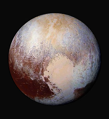 Four of New Horizon's detailed images of Pluto, taken 280,000 miles (450,00 kilometer) away from the dwarf planet, were merged with color data from the Ralph intstrument to create a natural and phenomenal work of art; both artistically and scientifically, for, thanks to the false coloring, scientists were able to see Pluto's texture and composition. The results? That stretch of flat ice plains, Sputnik Planum (that looks like the shape of a heart), is now believed to have "a source region of ices" in its center. The transportation of exotic ices from Sputnik Planum are suggested to be the "lobes" of this heart-shape geologic feature.
