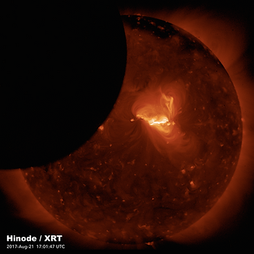 An image of the Moon passing over the Sun taken by the international Hinode solar observation satellite.