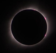 Eclipse observers of the eclipse may have noticed pink on the edges of the Sun, or the solar corona. Siegal assures that this wasn't some trick of the eye, but the result of hydrogen atoms ionizing in the corona and those free electrons going through a series of transitions as they fall back into hydrogen nuclei, creating red lines, or flares. That, with the white light of the solar corona, is what produced the pink that was seen around the perimeter of the Sun. "The pink effect was real," says Siegal.